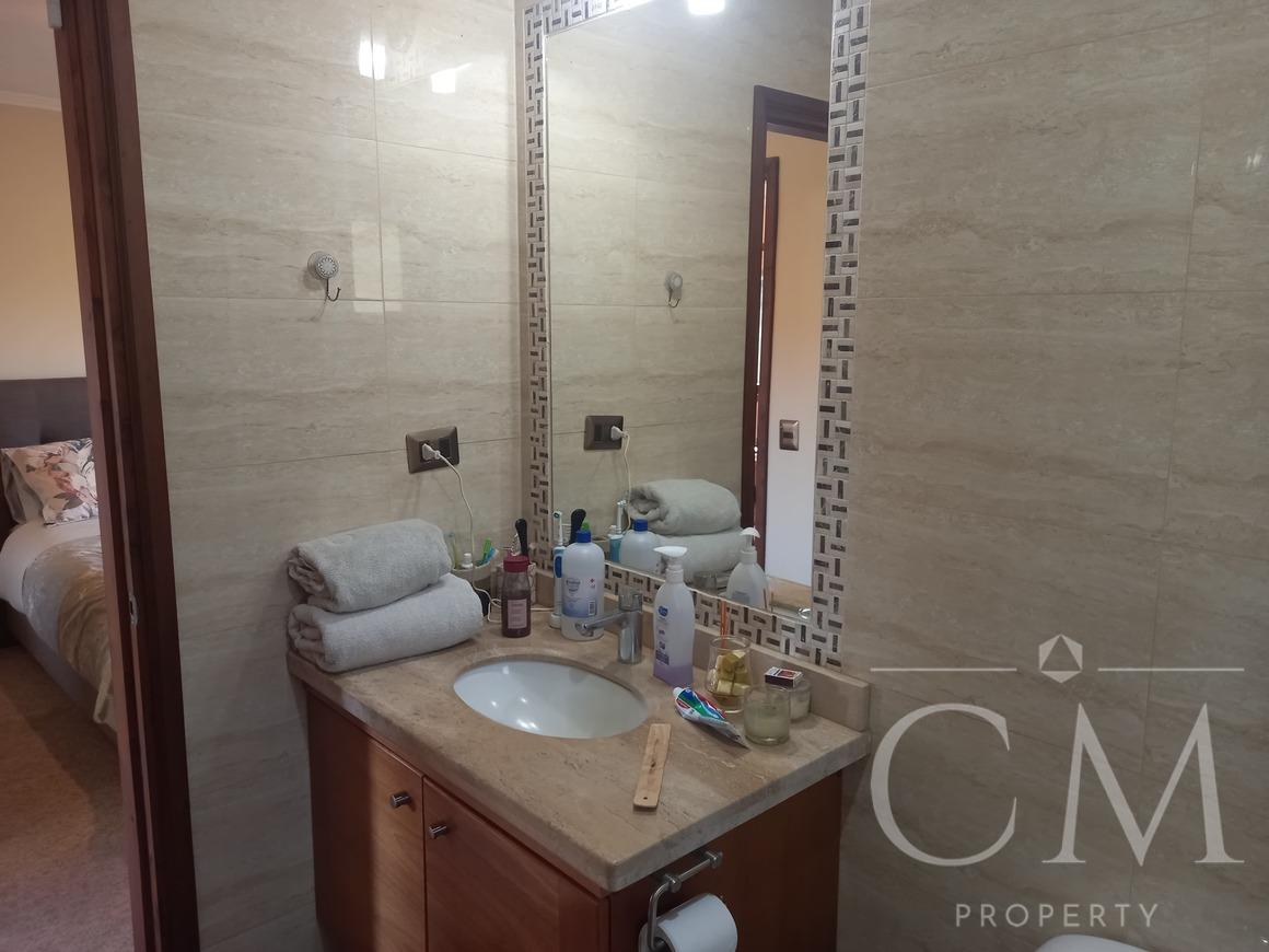 Hall de acceso, living comedor, sala de estar, cocina amoblada y equipada con encimera y horno eléctrico, comedor de diario, sala de estar, tres dormitorios y dos baños, principal en suite con walking closet, logia, terraza, calefacción central a leña con radiadores, bodega, leñera, estacionamientos, patio, ante jardín, ventanas termo panel y piscina sobre nivel.