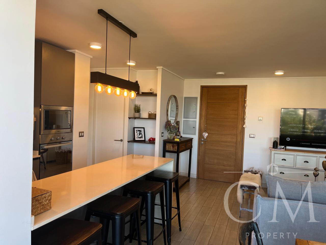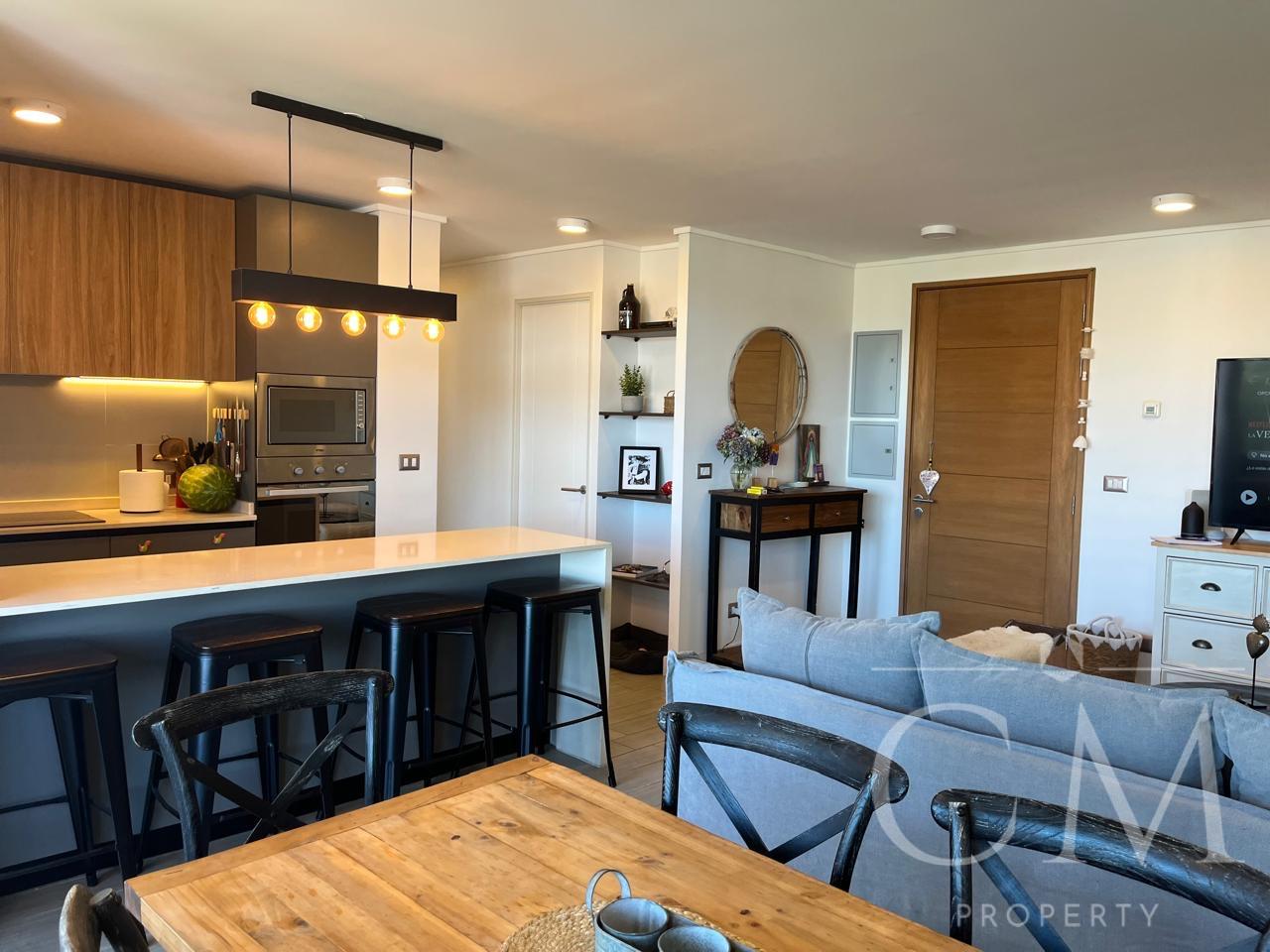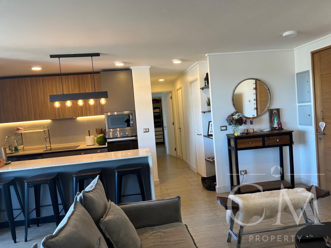 Se vende moderno y luminoso departamento en cuatro piso, en Edificio Península Vista, a solo dos cuadras del centro de la ciudad. Cercano a colegios, comercio, servicios en general. Cuenta con living comedor, cocina integrada con despensa y logia, dormitorio principal con baño en suite y walking closet, el segundo dormitorio posee baño completo. Además, Terraza, dos estacionamientos y bodega. Terminaciones de alta calidad: ventanas termopanel PVC, cocina full con cubierta de quarzo, equipada con encimera vitrocerámica, horno y campana eléctrica, muebles italianos Biefbi Cucine, piso de porcelanato en todo el departamento